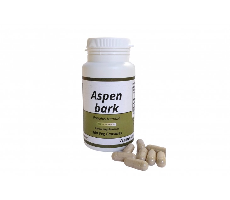 Aspen bark (Populus tremula) naturally contains bioactive plant compounds such as flavonoids, tannins, and phenolic substances.
